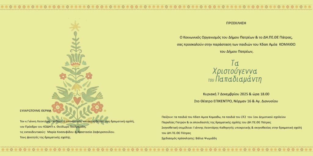 Post category:ΑΝΑΚΟΙΝΩΣΕΙΣ ΤΜΗΜΑΤΟΣ ΚΔΑΠ - ΚΔΑΠ ΜΕΑ - ΘΕΡΙΝΑ ΚΔΑΠ / ΔΕΛΤΙΑ ΤΥΠΟΥ Post published:1 Δεκεμβρίου, 2025 ΧΡΙΣΤΟΥΓΕΝΝΙΑΤΙΚΗ ΓΙΟΡΤΗ ΚΔΑΠ ΑΜΕΑ ΚΟΜΑΙΘΩ Πάτρα 01-12-2025