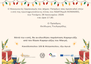 ΔΕΛΤΙΟ ΤΥΠΟΥ – ΛΕΙΤΟΥΡΓΙΑ ΥΠΝΩΤΗΡΙΟΥ ΚΟΙΝΩΝΙΚΟΥ ΟΡΓΑΝΙΣΜΟΥ ΔΗΜΟΥ ΠΑΤΡΕΩΝ ΛΟΓΩ ΨΥΧΟΥΣ13 Ιανουαρίου, 2026 Περισσότερα...